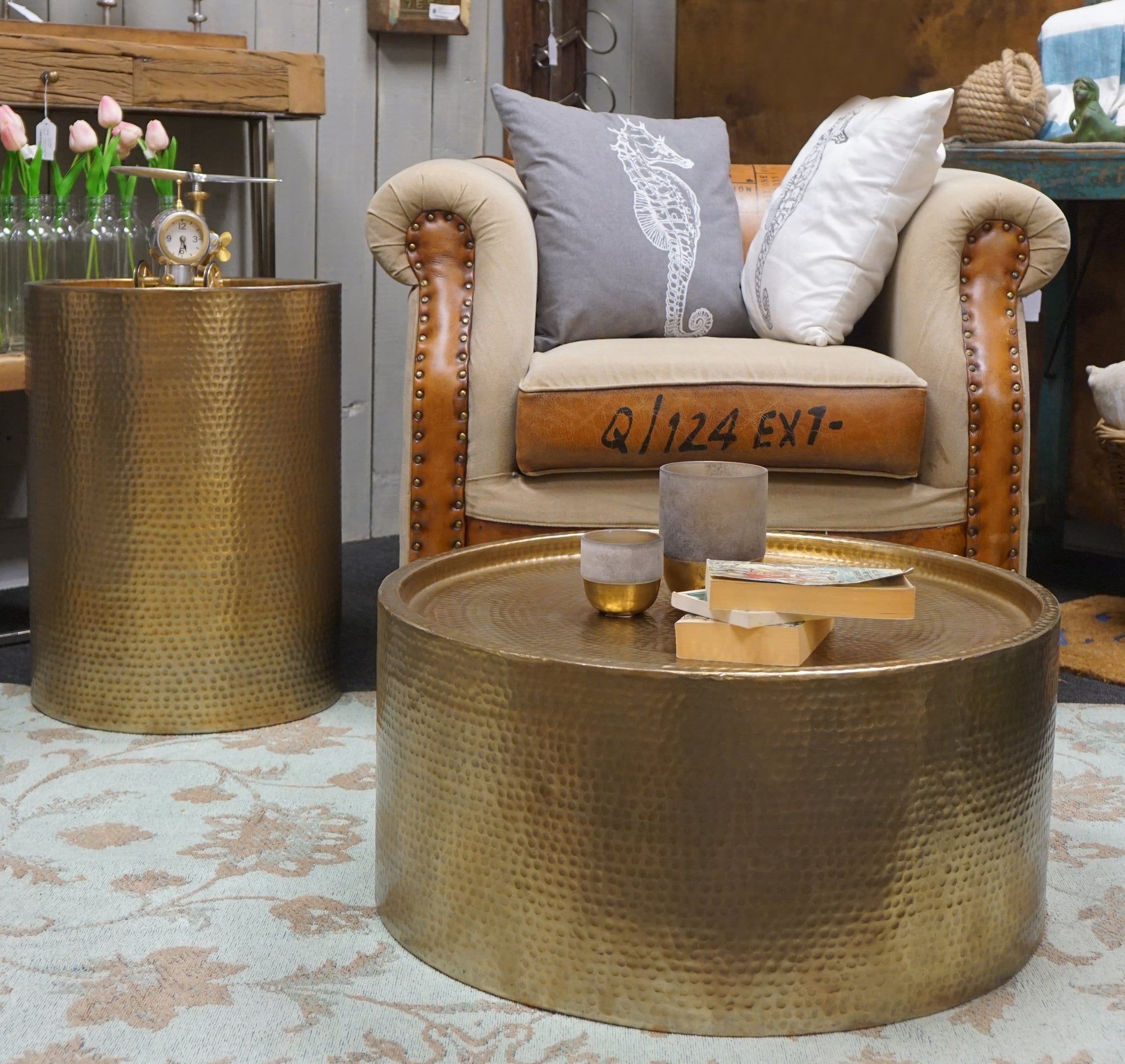 Sigurd Hammered Drum End Table, Small, Antique Brass