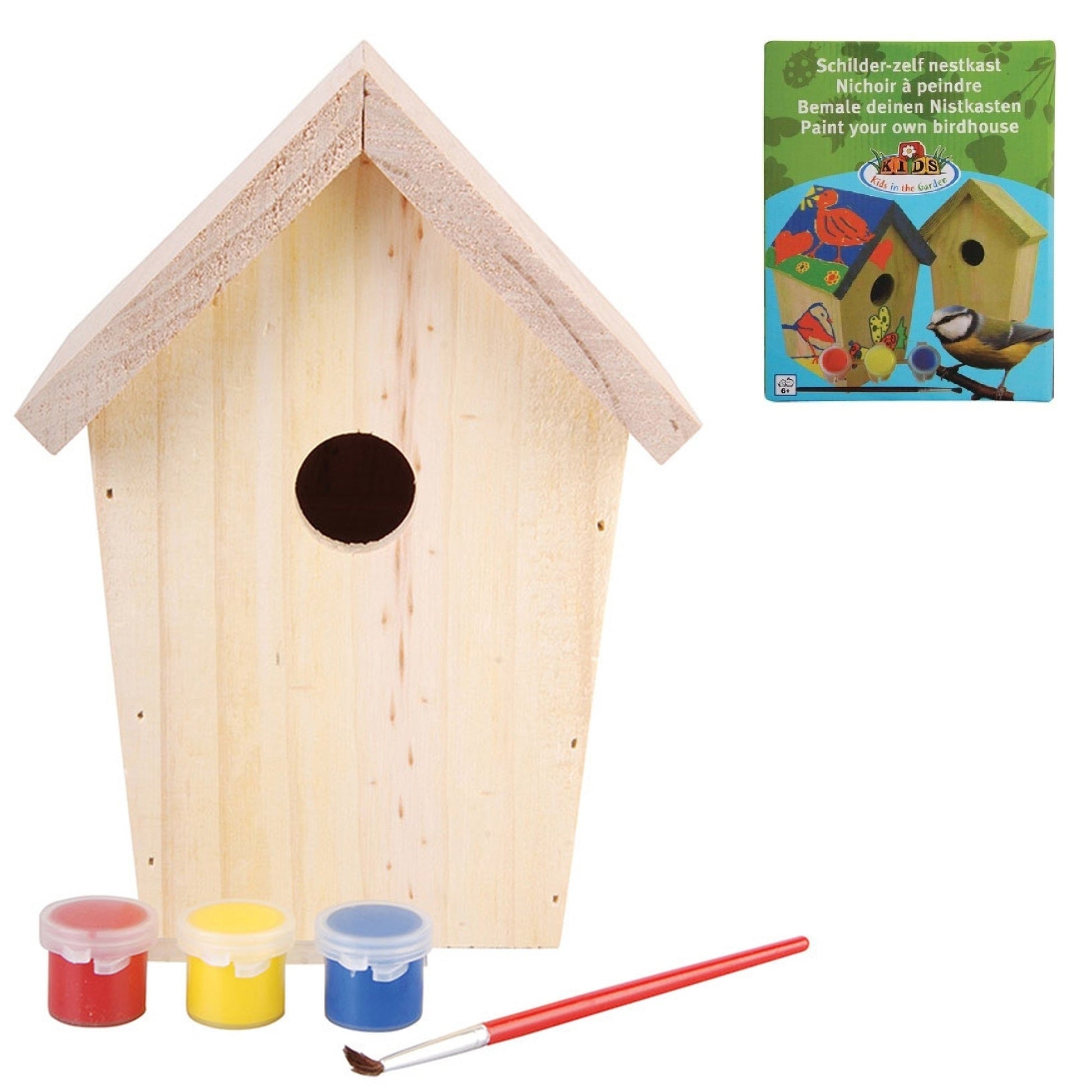 No garden can do without a nesting box. Use the paintbrush to paint your very own bird house in very pretty colours. This nesting box is suited for the Eurasian blue tit. Aside from the Eurasian blue tit, you may also expect to see the Crested tit, the Marsh tit, the Willow tit and the Coal tit in this nesting box. The proper location to hang this birdhouse is a quiet and somewhat sheltered spot (aka not directly in the sun or on the rainside) with a free flight path for the bird. Autumn is the best time to clean the birdhouse. During the winter time this birdhouse will often provide birds with a place to hide from the bad weather.- wooden birdhouse with 3 paint colours and brush- can be opened on the bottom- key hole opening on the back- packaged in full colour giftbox- fixtures not included