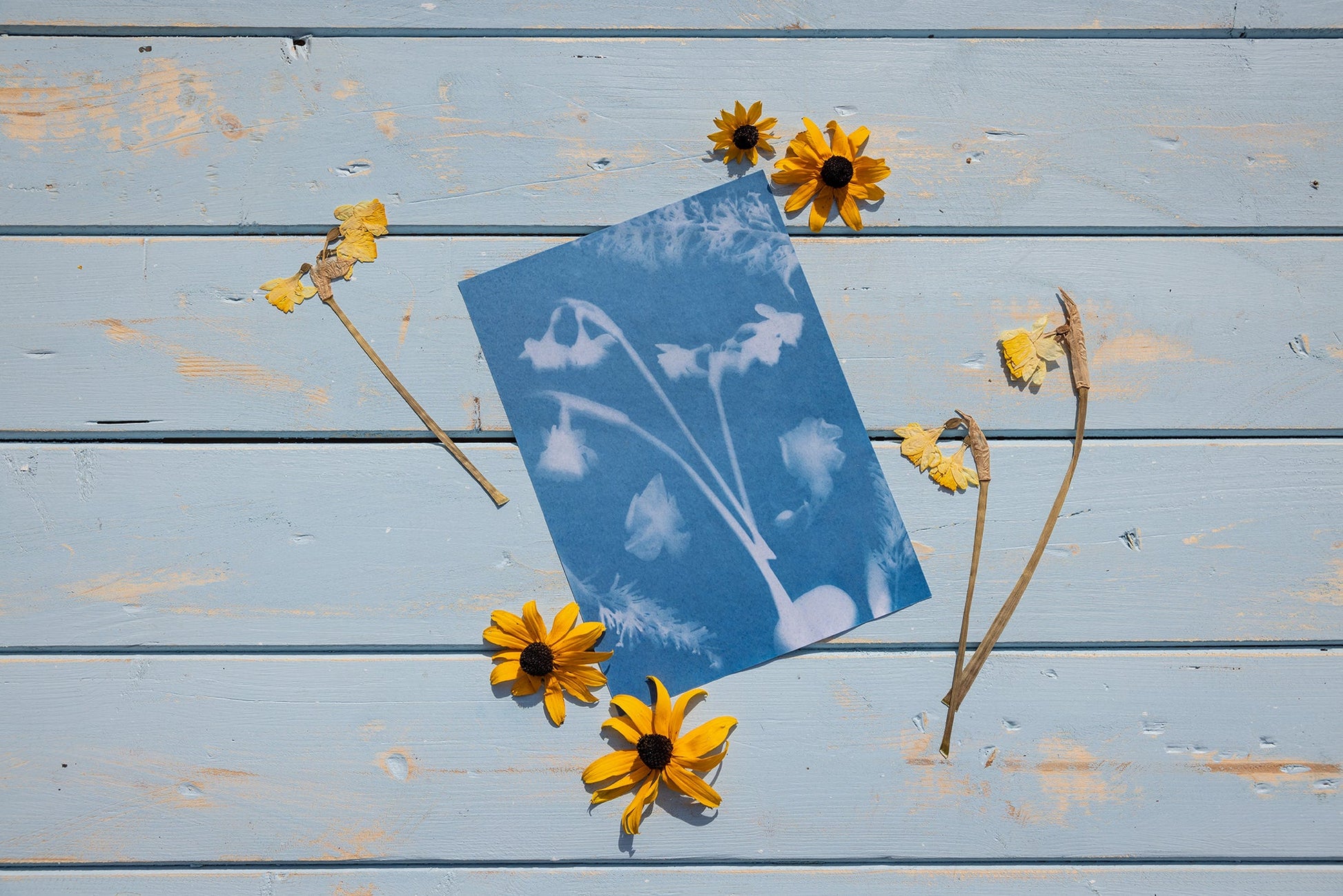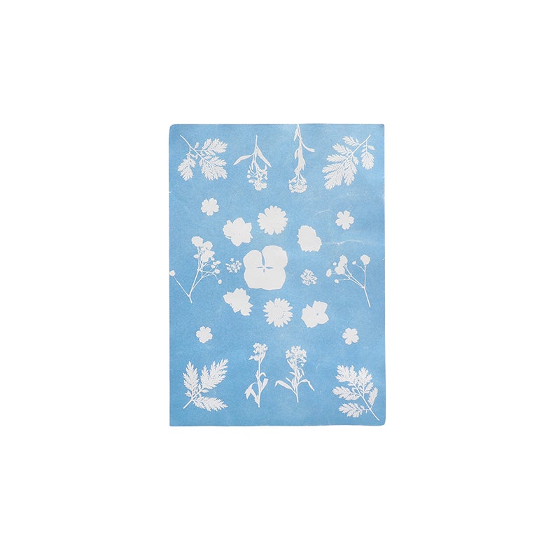 Use the power of the sun, capture its shadows and make unique creations with this solar photo paper. How does it work? Place a sheet of paper on a flat surface and arrange beautiful objects, such as flowers or feathers on it. Place the paper in the sun for 3 to 10 minutes then remove your objects from the paper. The shadows that blocked the sun will turn white, creating a negative image of your composition. Rinse the paper under the tap for 2 minutes and then hang the paper up to dry. The blue colour will darken after a while. - UV light-sensitive paper, to be exposed to the sun- recycled paper - develop and fix with tap water- no darkroom needed - non-toxic