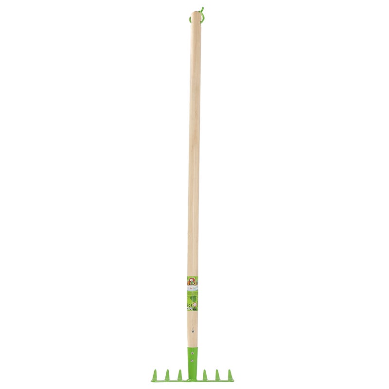 You’ll be just like a real gardener with your very own garden toolset. This green metal rake with wooden handle and eight prongs can be used for preparing the soil before sowing and raking in the seed of grass for instance. Of course it can also be used to loosening or evening out the soil. The rake’s length makes it perfect for children.- suspension rope