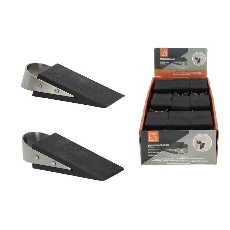This rubber door wedge stops doors from banging shut. The doorstopper has a modern design and can be jammed firmly under the door. The door wedge does not scratch. - packaged in a table display- made of rubber- anti-slip- does not scratch- can be used indoors and out