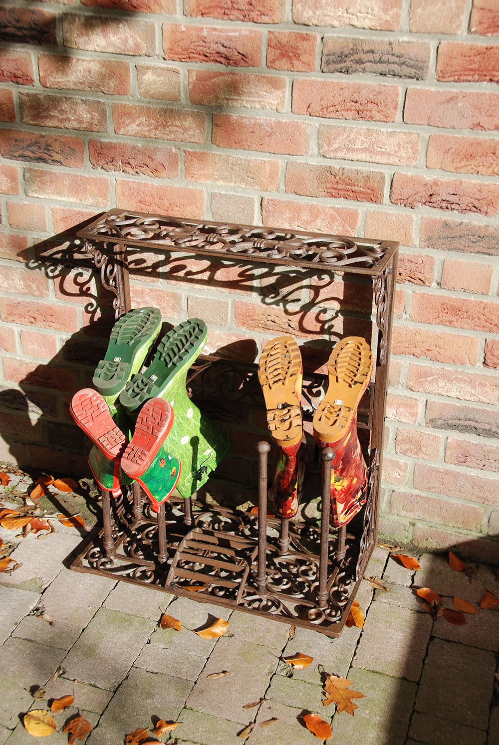 This decorative boot rack is a perfect solution to organise, store and clean boots. It is supplied with a scraper in he middle and has eight poles that can hold four pairs of boots, on the top of the rack you can place smaller items. The underside comes equipped with four rubber feet to prevent scratching of the floor. These decorative cast iron parts have been hand cast according to age-old tradition and craftsmanship.- suitable for both inside and outside- easily mounted- packed in brown box with line drawing