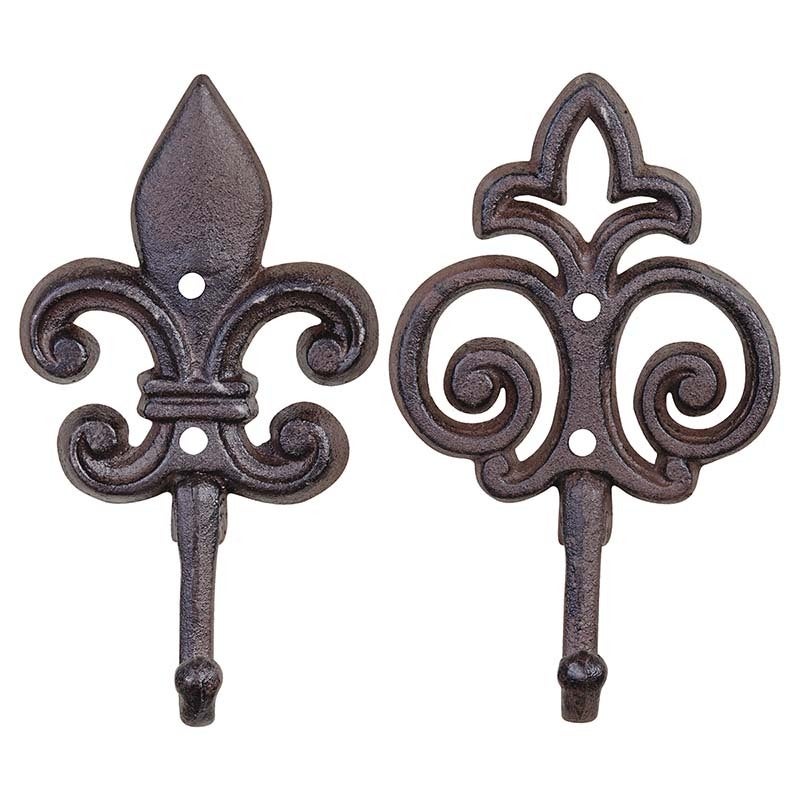 The rustic cast iron hook with fleur-de-lis design can easily be mounted by the two fixing holes. The hook can be used to hang tools or other items. Each is hand cast according to age-;old tradition and craftsmanship.- assortment of 2 hooks- easily mounted