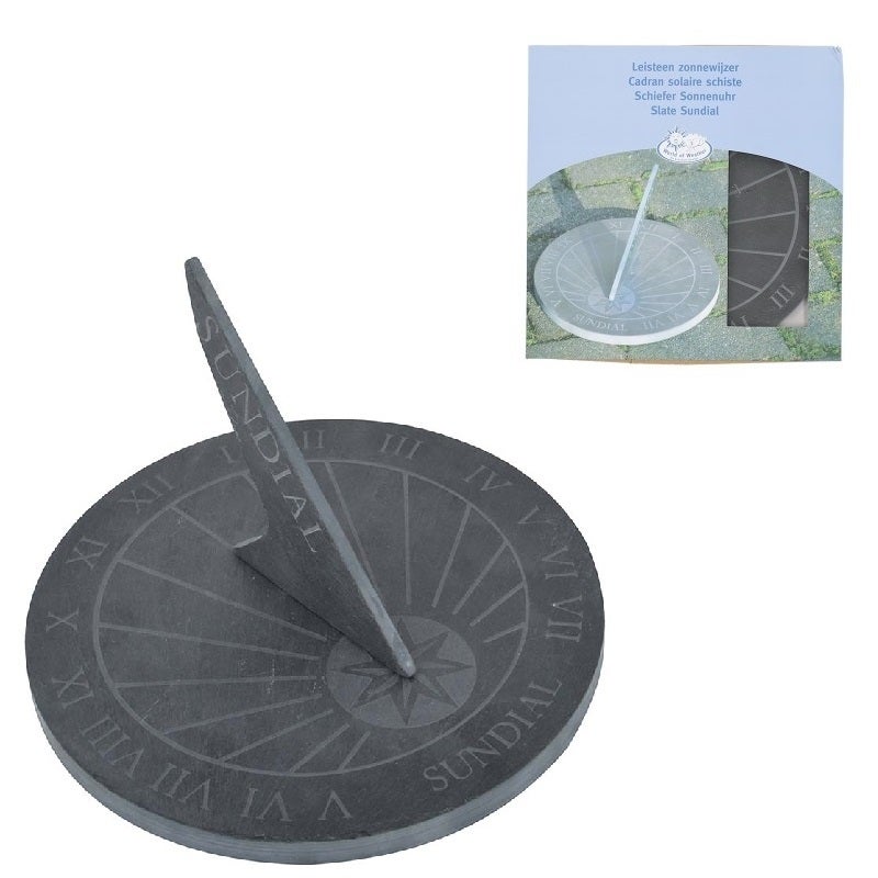 This sundial is an eyecatcher in any garden. The time can be read by pointing the 12 o'clock line north/south. Made from natural slate which withstands all kinds of weather.- made from slate- withstands all kinds of weather- with "sundial" text