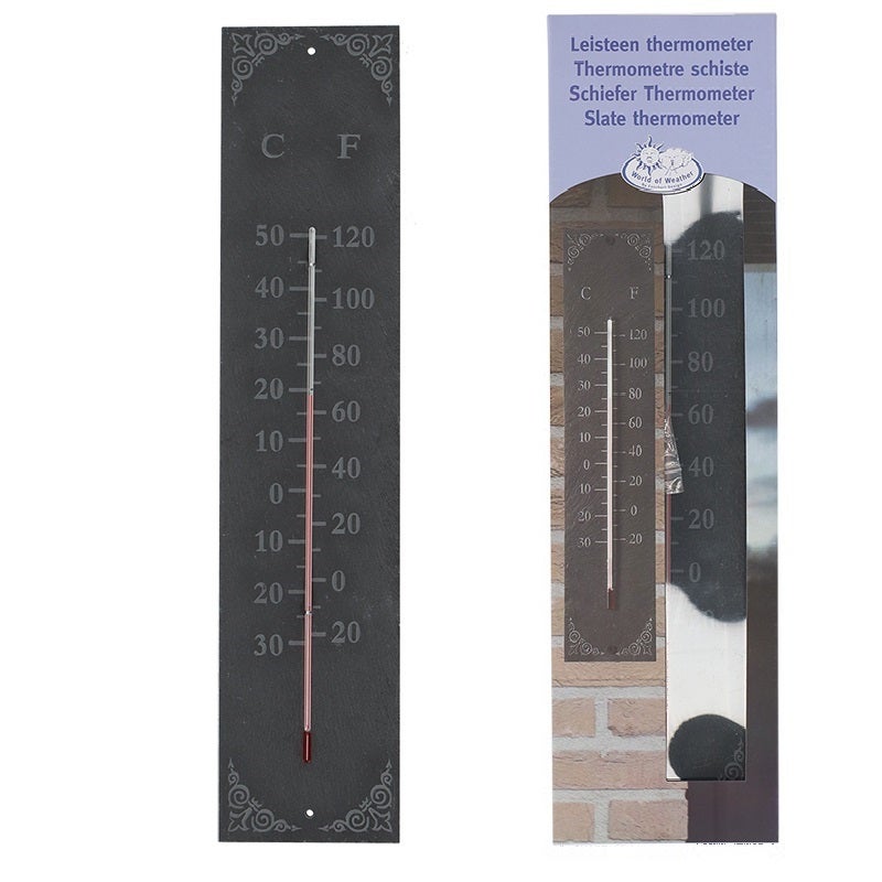 The scale of this thermometer is displayed in Celsius and in Fahrenheit and indicates temperatures between -30°C and +50°C, -20°F and 120°F.- scale in Celsius and Fahrenheit- made from slate- packed in a gift box- with suspension holes