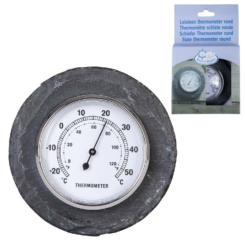 This thermometer with large, easy to read dial has a scale in Celsius and in Fahrenheit.- scale in Celsius and Fahrenheit- with slate edge- packed in a gift box- with hanging eye