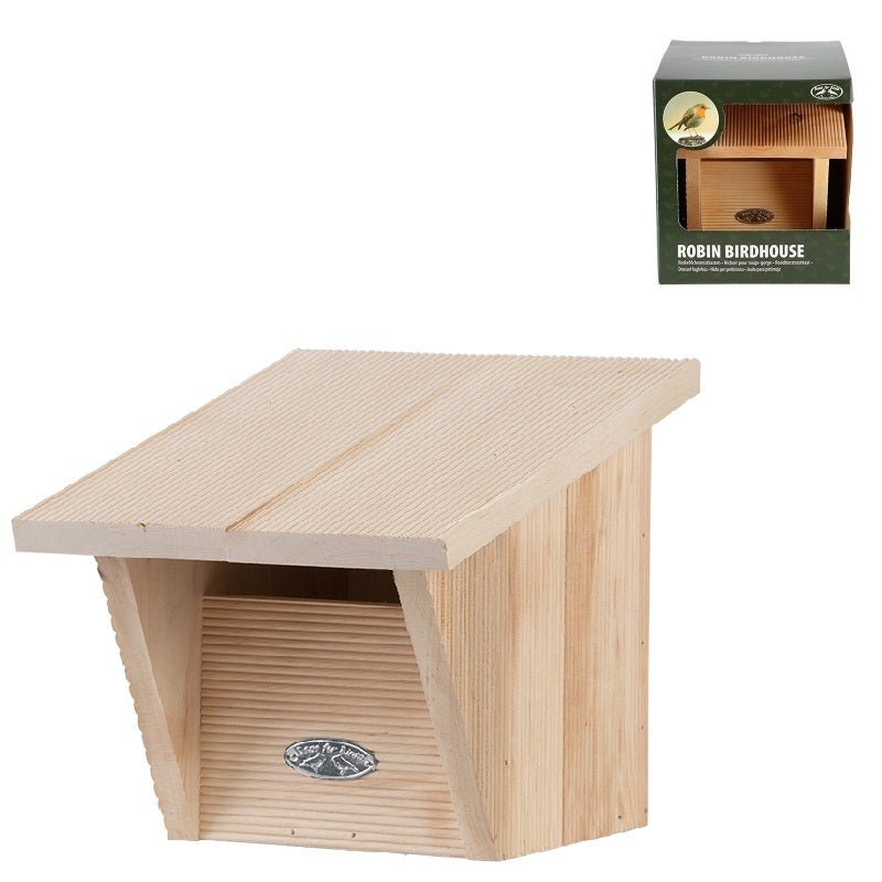This birdhouse has been designed for the Robin. Except for the Robin, you can also expect the Spotted Flycatcher and the Common Redstart to visit the birdhouse. For Robins you need to place the birdhouse in a well hidden place, on or near the ground (max. up to 1.5 m (4.9ft)) among dense bushes or vines therefore not in the direct sunlight or on the side catching the rain and an obstacle free approach route for the bird. For the Spotted Flycatcher and the Common Redstart you need to hang the birdhouse on a tree or wall, at a height of 1 to 5 m (3.3 to 16.4 ft). Fall is the best season to clean out the nesting box. During severe winter conditions, the nesting box offers shelter and protection to birds.- 18mm thick walls which provide perfect isolation- Sloping roof, the water will flow off- Overhanging roof which protects from wind and rain- Ventilation holes to prevent from overheating- Four drainage holes in the bottom- Inner side is rough and the front side is provided with grooves to help the young birds to easily climb out of the nesting box- Sides enclose the floor to prevent water coming in
