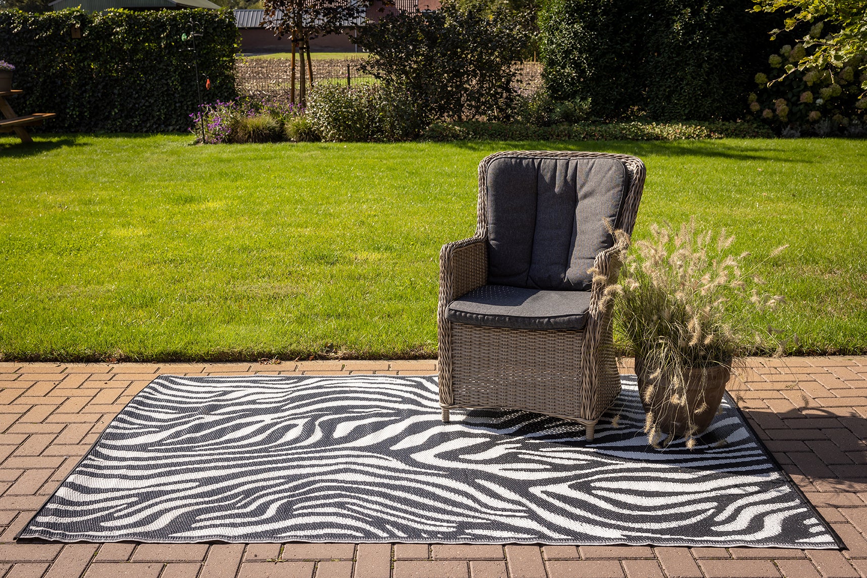 This rectangular garden carpet is an asset to any garden or patio. This striking zebra print garden carpet can change the look of your garden, patio or balcony in one go. The garden carpet is reversible, making it possible to adjust the look of your garden in no time. The carpet is easy to clean. - water-permeable- easy to clean- reversible