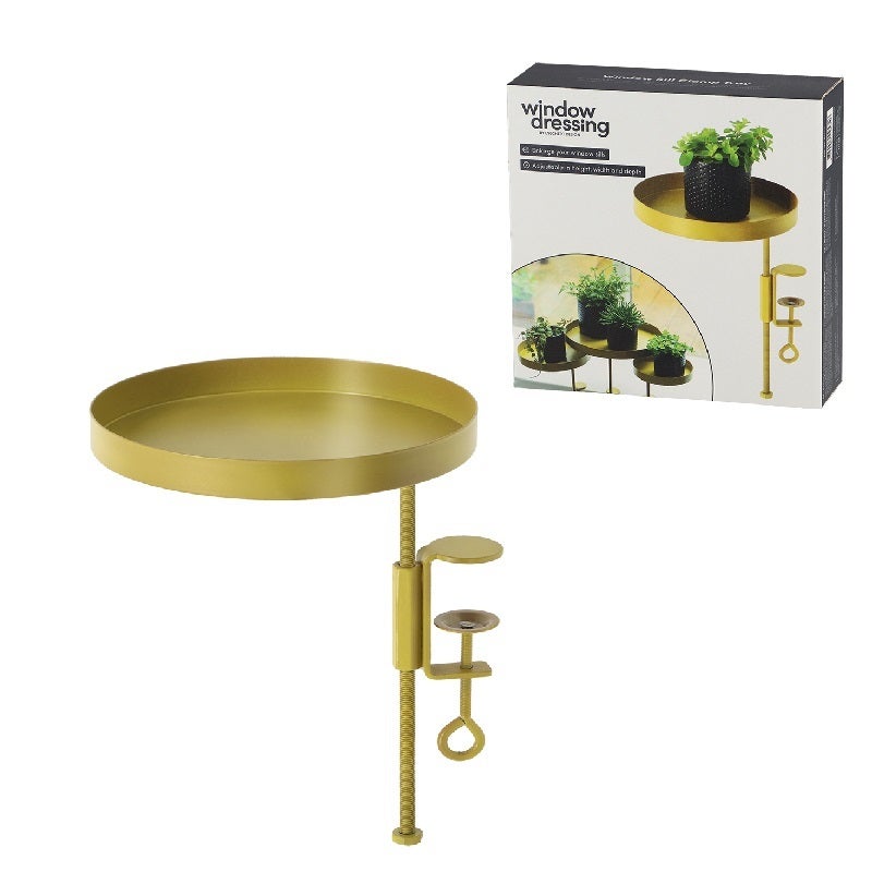 Liven up your window sill with this golden clamp tray. The window sill or table will be enlarged and the tray can be provided with plants or other items. Decorative and functional! The tray is adjustable in height and can be turned in different positions.- flatpack- packed in a gift box- enlarges the windowsill- the windowsill clamps are adjustable in height- easy to use