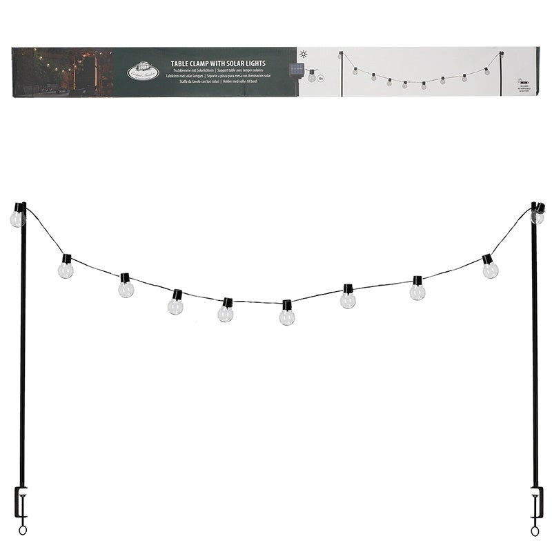 This black table clamp with solar lights creates a great atmosphere in the garden. This clamp makes it easy to illuminate your table with atmospheric solar lights. The clamp is adjustable in width, which means it almost always fits! - for tables with a maximum thickness of 97mm- full colour gift packaging