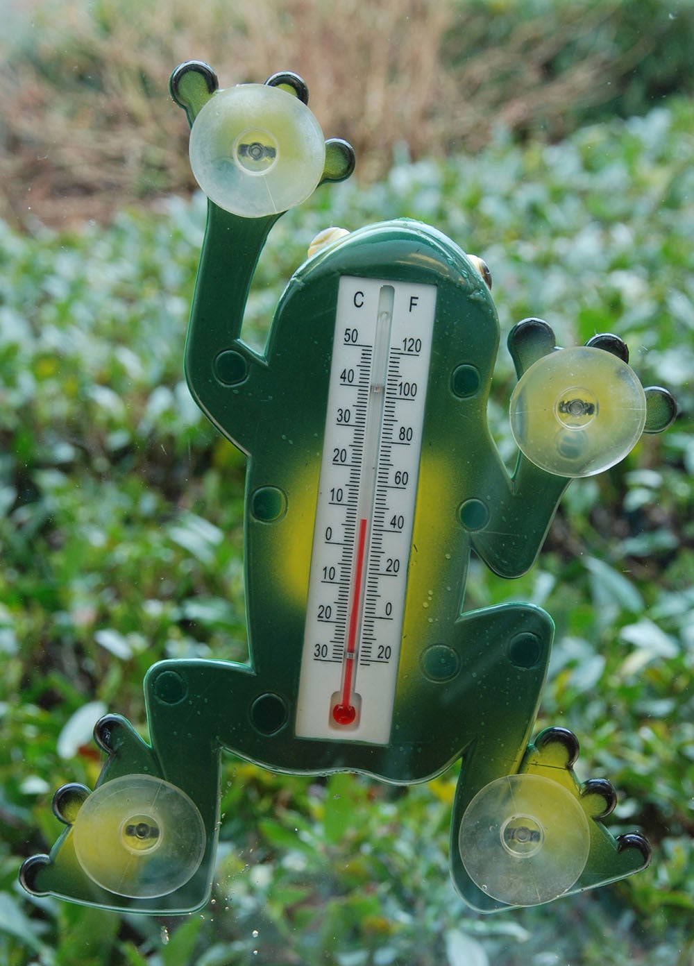 Frog with outside thermometer. Shows temperatures between: -30 to 50 ºC / -21 to 121 ºF. 4 suction cups included.