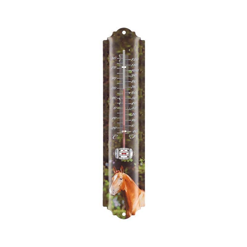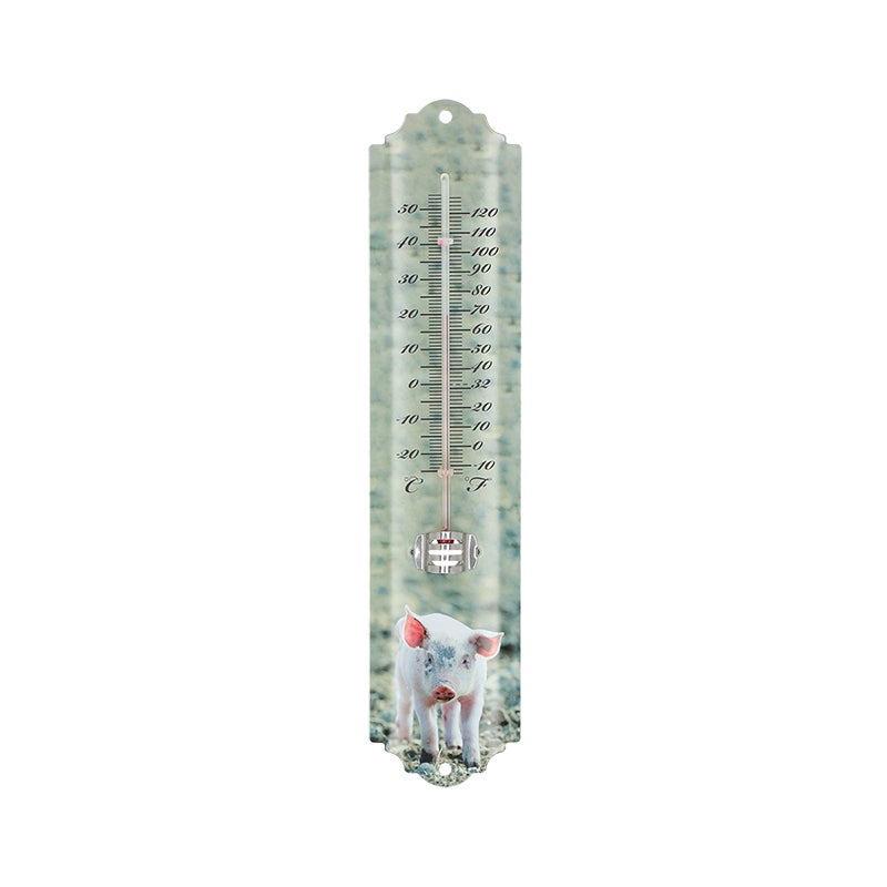 Bring the farm to your garden with this thermometer, with either chicken, horse, pig or cow photo print. This zinc thermometer shows the temperature in both Celsius and Fahrenheit.- assortment of 4 prints(chicken, pig, horse, cow)- temperature in Celsius and Fahrenheit- packaged on header card with euro lock