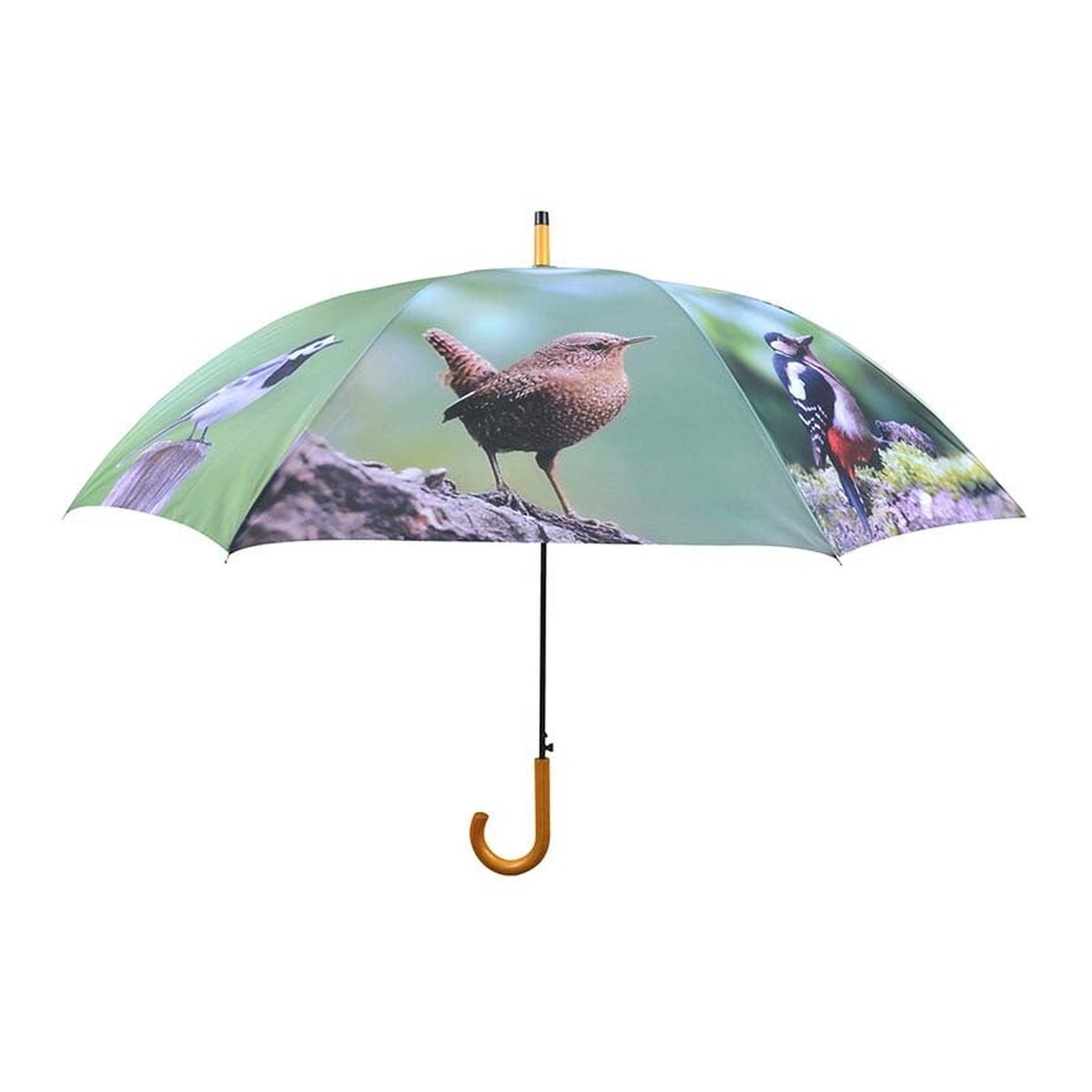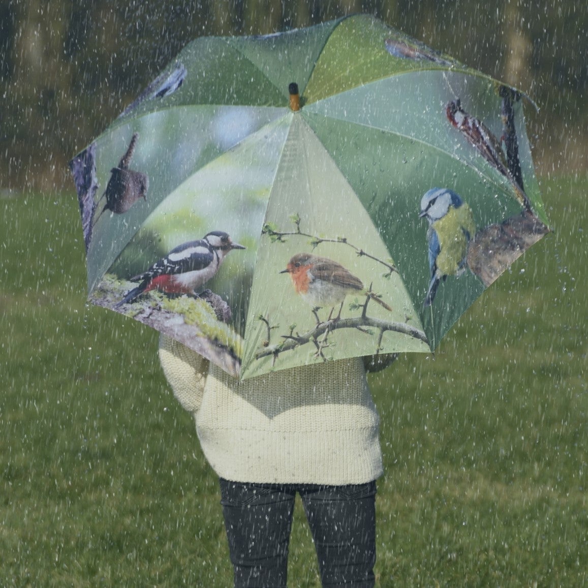 This photo print umbrella makes going for a walk in the rain a joy. This print depicts eight different birds: Robin, Chaffinch, House Sparrow, white Wagtail, Great Tit, great spotted Woodpecker, Eurasian Wren and Eurasian Blue Tit.