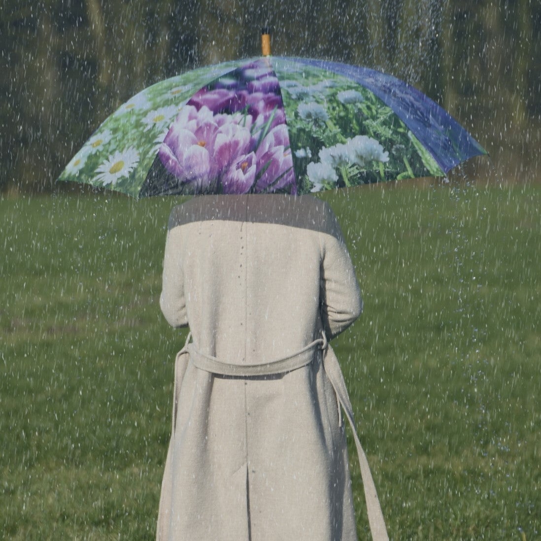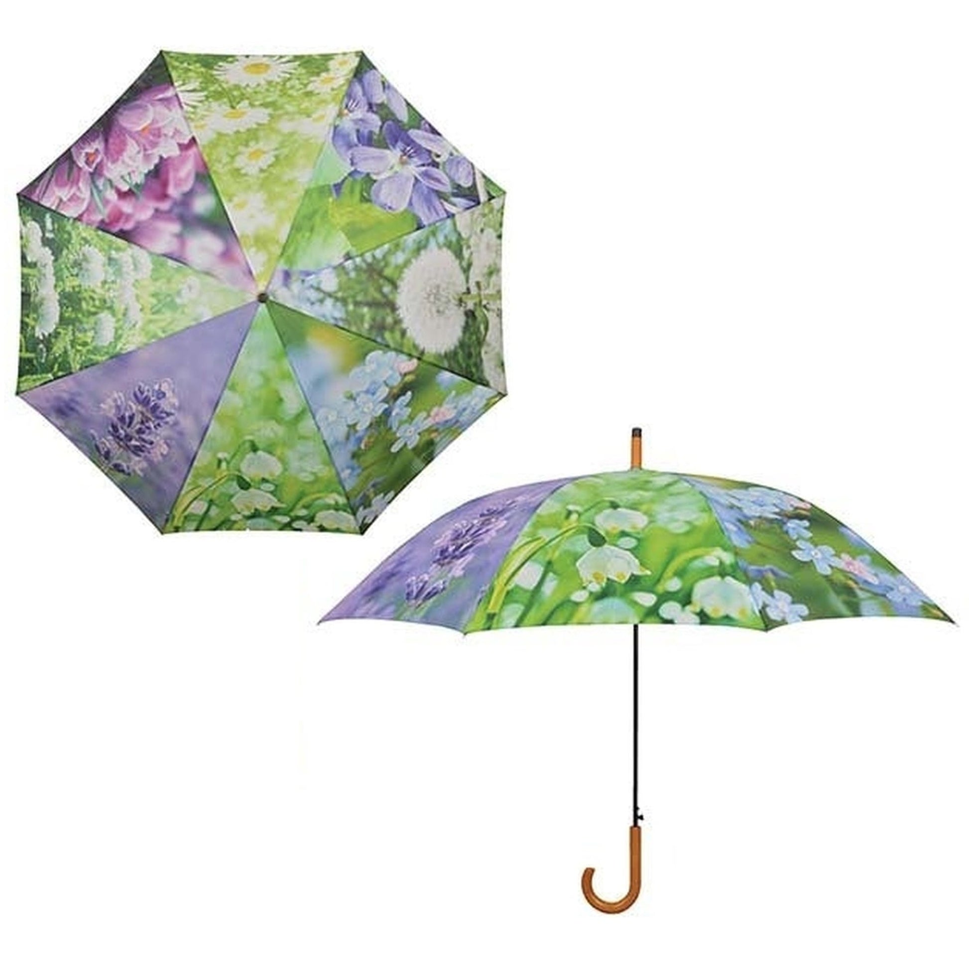 This photo print umbrella makes going out for a walk in the rain a joy. The print depicts eight different flowers: daisies, violas, dandelions, forget-me-nots, spring snowflakes, lavender, clovers and crocuses.