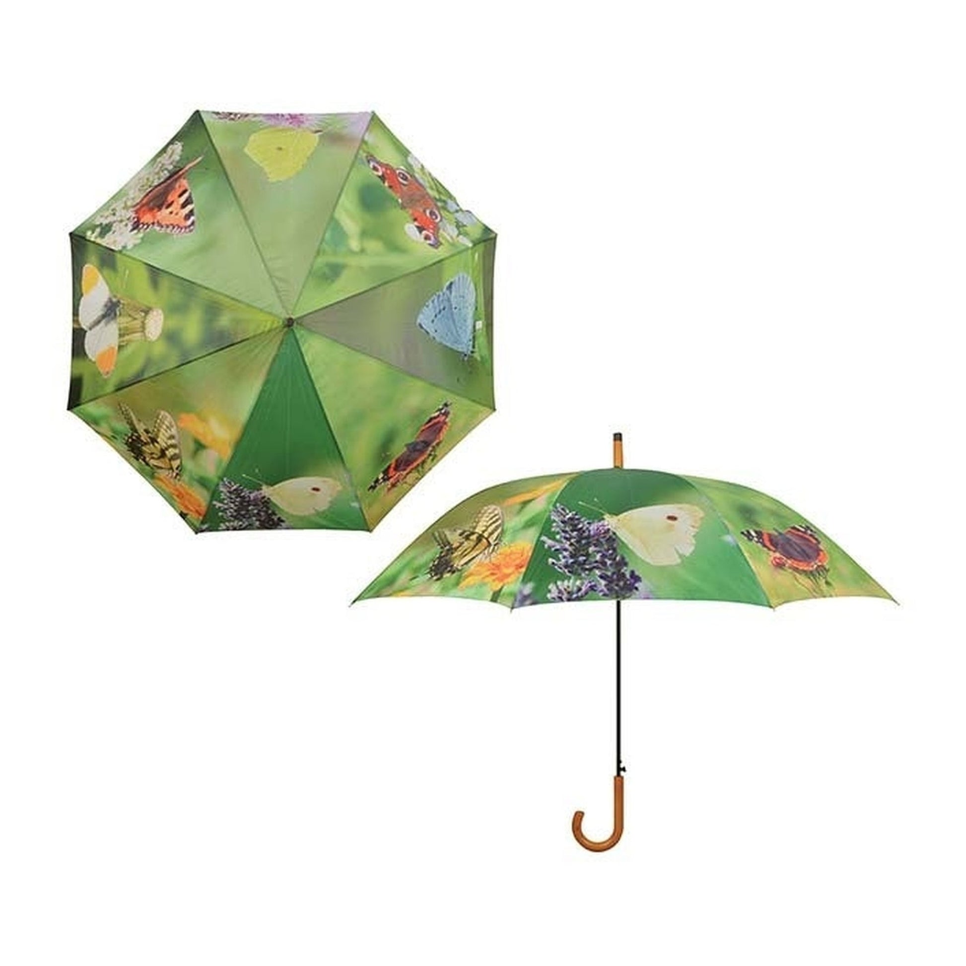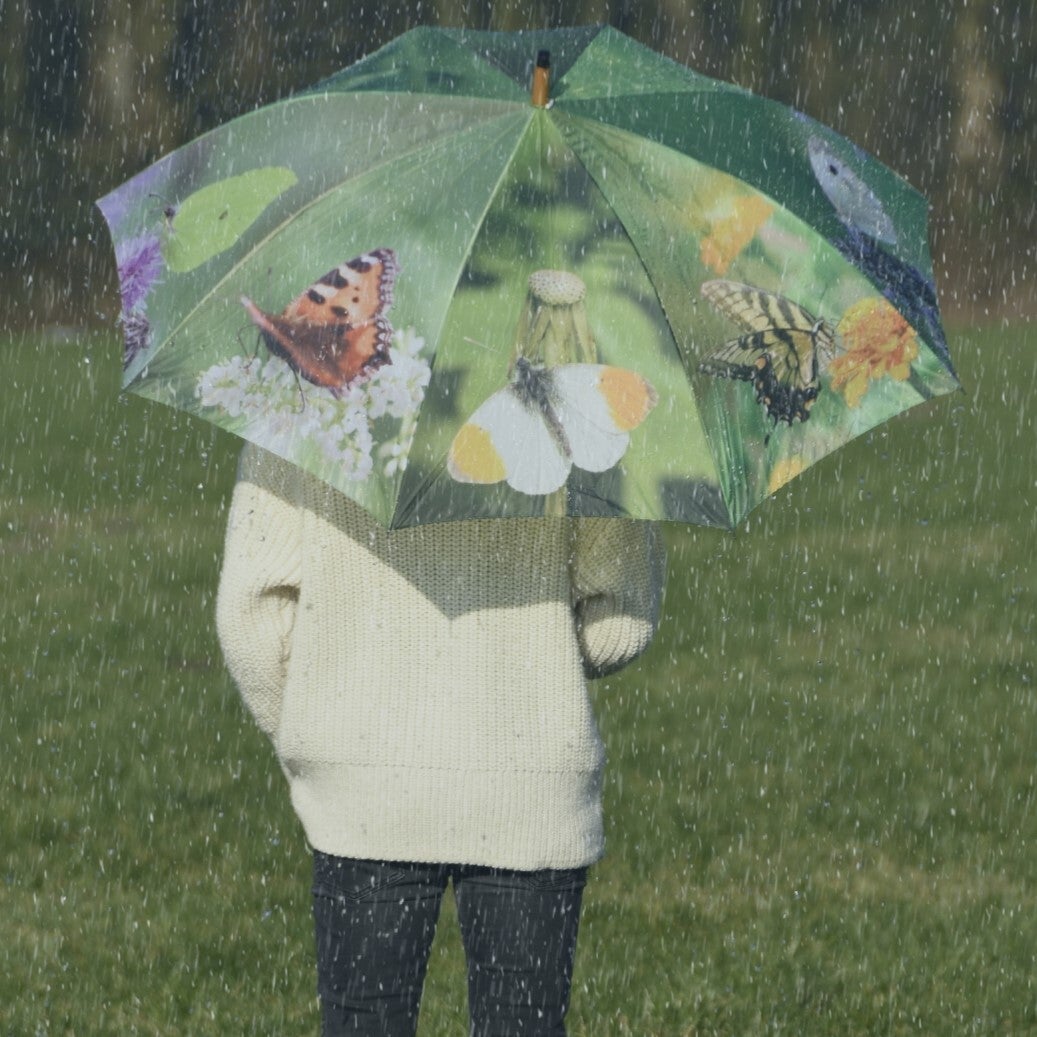 This photo print umbrella makes going out for a walk in the rain a joy. The print depicts eight different butterflies: common brimstone, European Peacock, holly blue, red admiral, small white, Old World swallowtail, orange tip and small tortoiseshell.