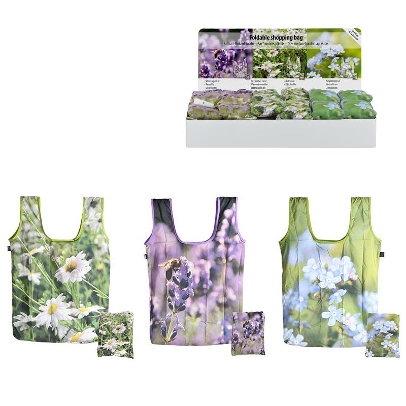 This light weight and water-repellent bag is always ready. The grocery bag can be folded into a smaller size making it easy to carry in the included cover. The cover comes with a clip that can used to attach it to, for instance, a keychain or a purse.- assortment of 3 printed designs (lavender daisy, forget-me-not)- reusable- lightweight- water repellent- packaged in table display