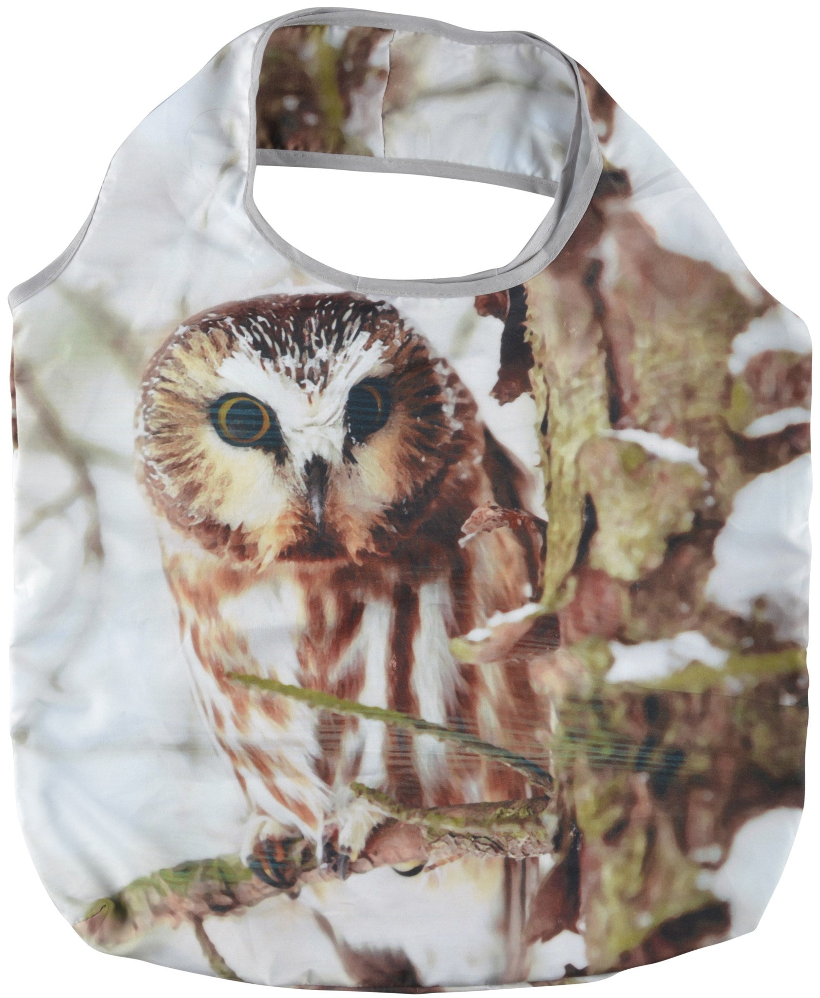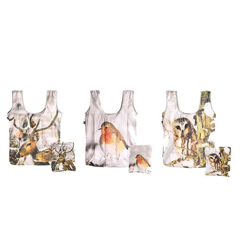 This light weight and water-repellent bag is always ready. The grocery bag can be folded into a smaller size making it easy to carry in the included cover. The cover comes with a clip that can used to attach it to, for instance, a keychain or a purse.- assortment of 3 printed designs (deer, robin and owl)- reusable- lightweight- water repellent- packaged in table display