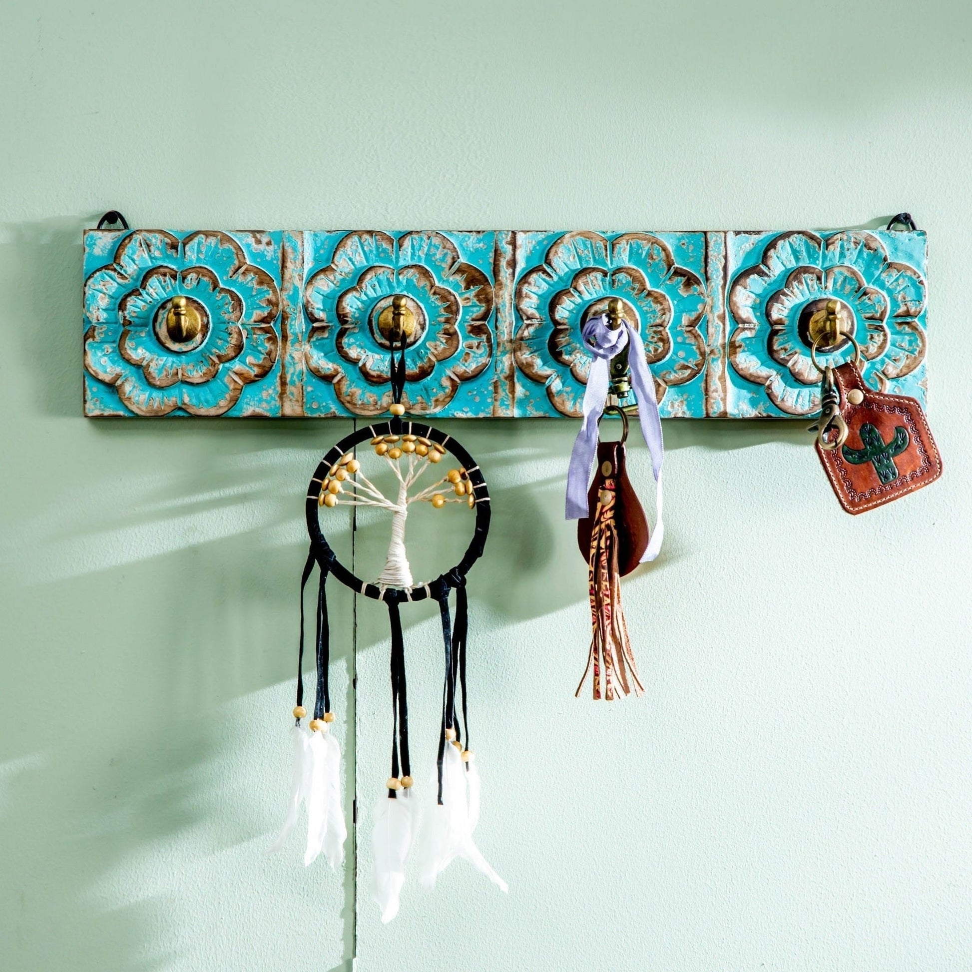 50% Off, Carved Wooden 4 Hooks Rack, Rustic Turquoise, India