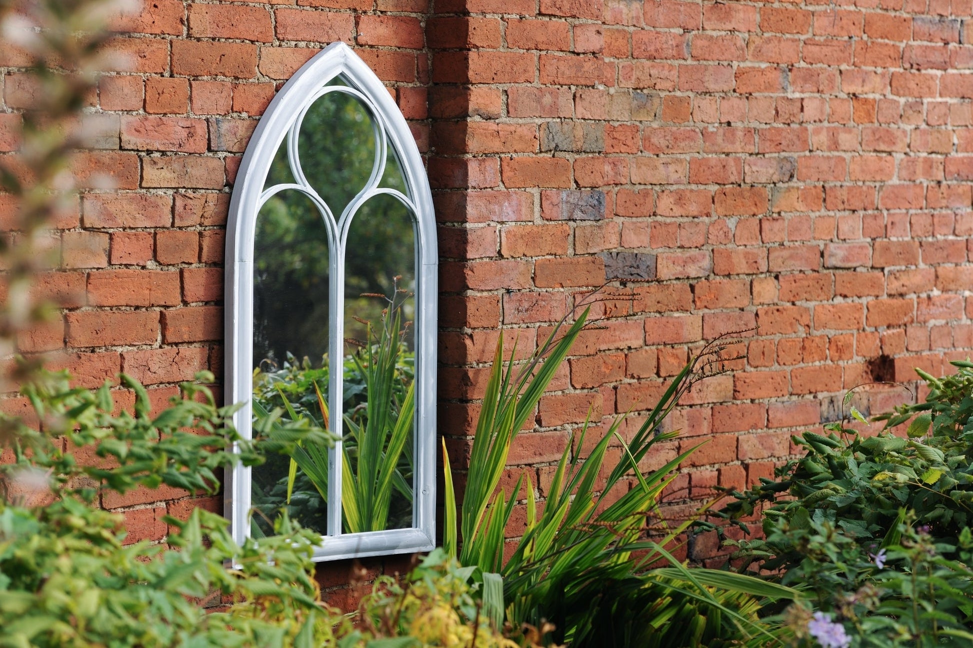 This mirror based on old church windows create visual space in the garden and are made specifically for the outside.